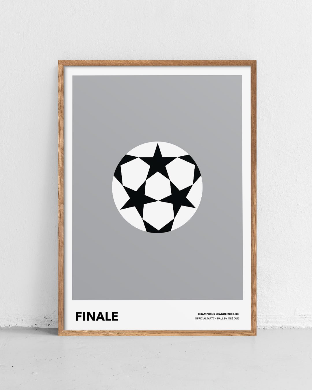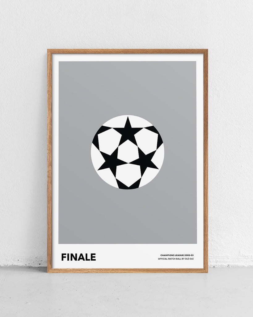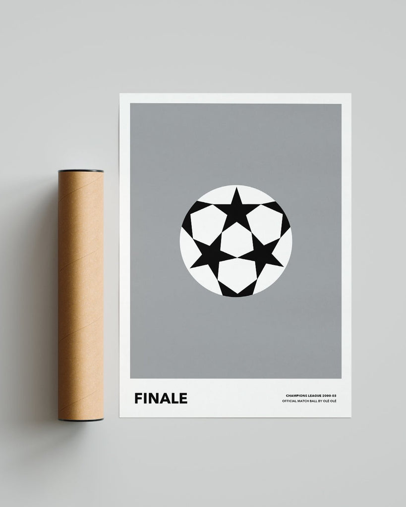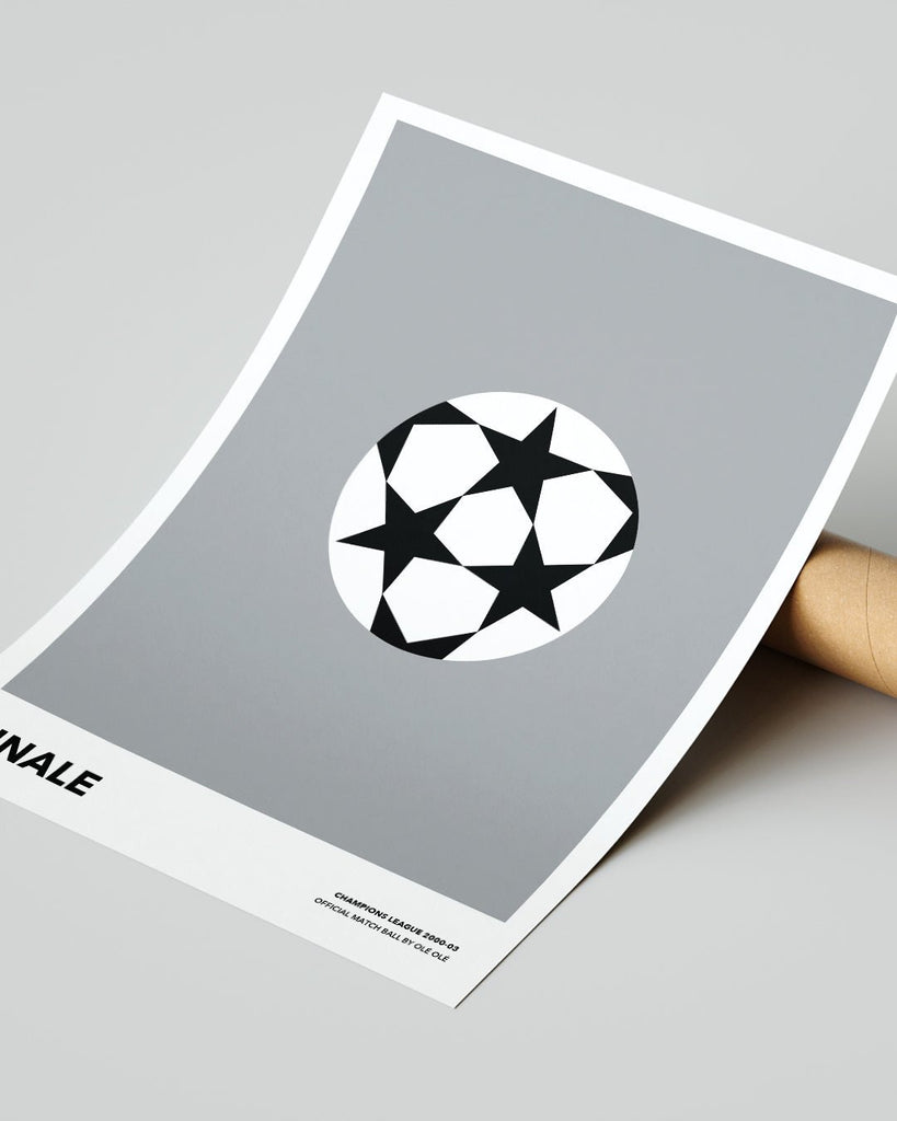 Football poster | In 2000, adidas took over as the official supplier of the Champions League ball, initially providing it only for the semi-finals and final. Two decades on, that iconic star pattern has become inseparable from the competition, evolving in colour and detail each season. It’s the ball Zinedine Zidane scored one of the most unforgettable goals in final history against Leverkusen.
