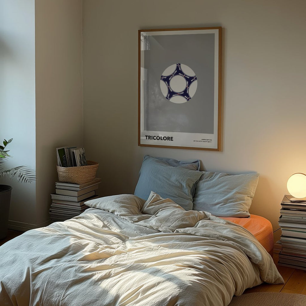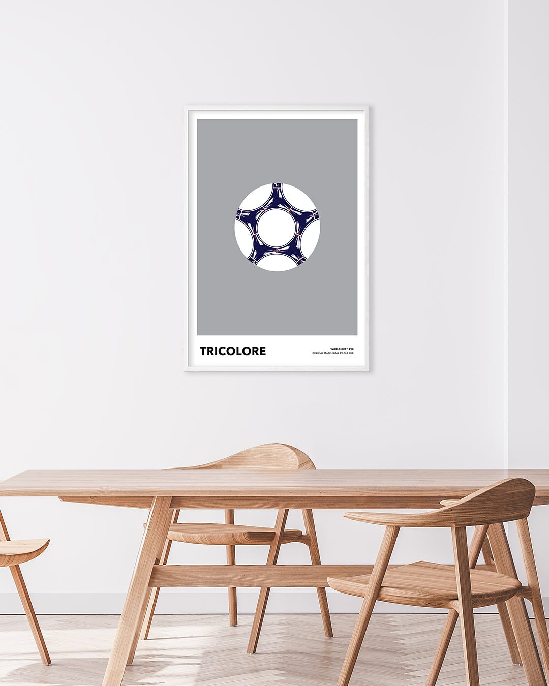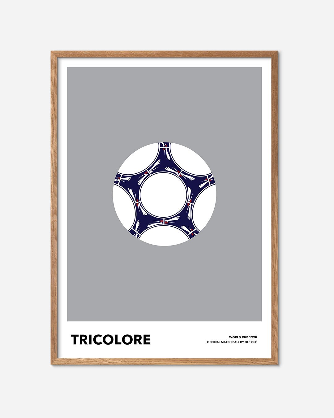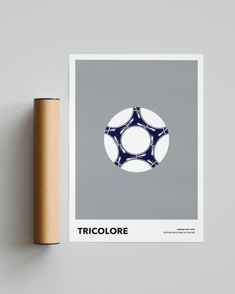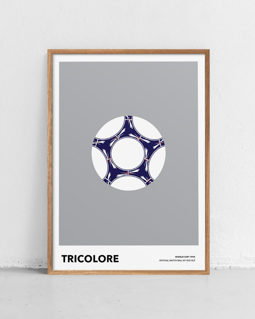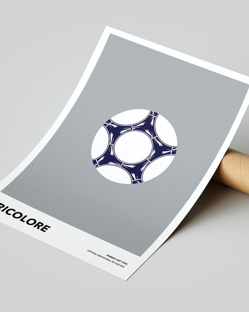 Football poster | The last World Cup ball to feature the iconic Tango design also marked a bold first—it introduced color beyond the traditional black and white. With a striking blue graphic accented by hints of red on a white base, the design paid homage to the flag it was named after. Who could forget Michael Owen weaving through the Argentinian defense before rifling the Tricolore past a helpless keeper? Or Ronaldo—R9 himself—making his mark in the brand-new Mercurial boots, the ball glued to his feet?